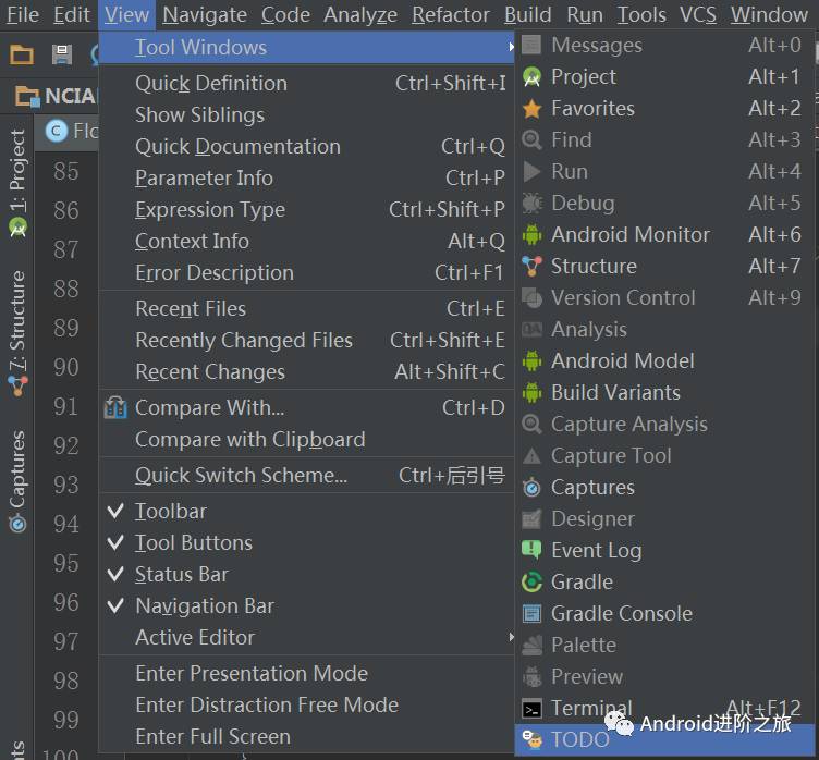 在 Android Studio 中,支持通过 TODO 在代码中插入标记,其本质上就是特殊的注释。只不过 TODO 注释能够在 Android Studio 提供的 TODO 视图窗口中查看并快速定位。