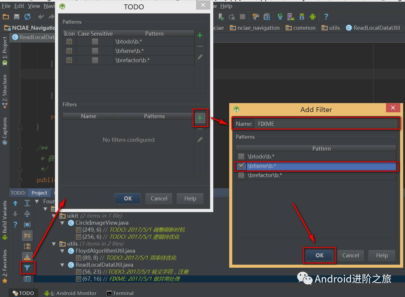 首先,添加过滤 FIXME 的条件,点击 TODO 窗口左侧的漏斗,选择 Edit Filters,按照图示添加 FIXME 过滤条件: