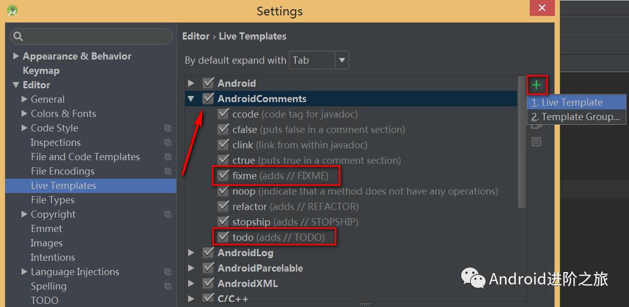 首先,点中 AndroidComments,点击右上角 ”+“,选择 Live Template :
