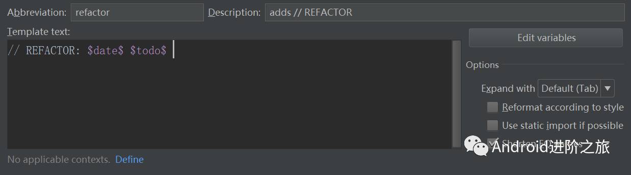 在界面下方,有一段文本:No applicable contexs yet. 后面跟着一个 Define,点击就会弹出模版运用上下文的列表。我们一般是在 Java 代码中添加 REFACTOR TODO,所以全选 Java,当然你也可以按需选择。