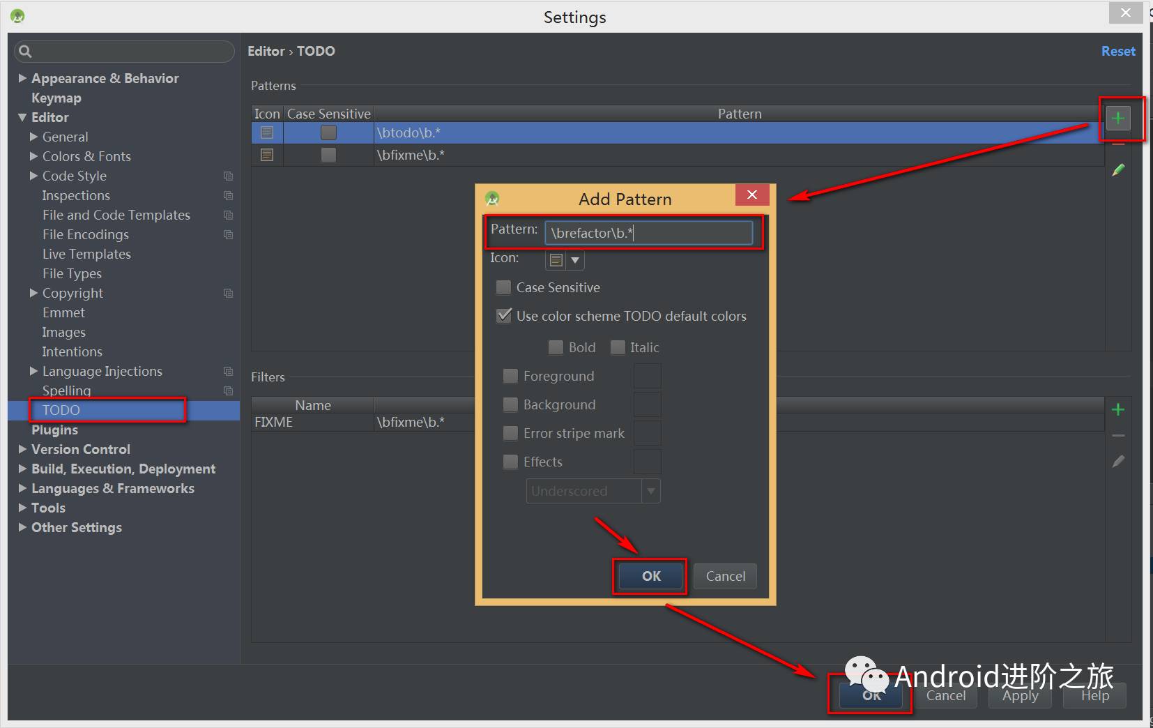 在 Pattern 中输入正则表达式 \brefactor\b.*,然后选择一个 Icon(可选),点击 OK 关闭添加面板,再次点击 OK 应用并关闭设置面板。