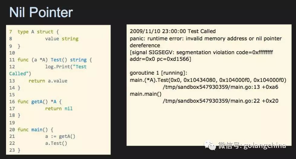 Go里面我们常见的两个问题,一个是Nil Pointer, 另一个是Dns Resolution。首先讲Nil Pointre。右边这个图大家应该很熟悉,大家可以看看这个代码有没有什么问题。我们有一个structA,它自己有一个成员函数Test,我们有一个getA生成的函数,这个函数返回一个nil,我们调用函数获得A的时候执行Test,奇怪的是A到Test这条打印消息能够被看到。当你一个getA返回A指针类型的时候,你可以调用Test的函数。如果大家有一个类似getA有很多分支的函数,它在很边缘的条件下会返回nil的条件下,大家要注意了。有人讲过,让空值有用起来,如果你想撤nil可能你需要加这一行,这个代码在很多库里面有出现过,大家有兴趣的话,可以去看看这个 视频(https://www.youtube.com/watch?v=PAAkCSZUG1c&t=6m25s ),是讲述Go空值的运用以及合理处理的问题。这是曾经困扰我们很久的问题。