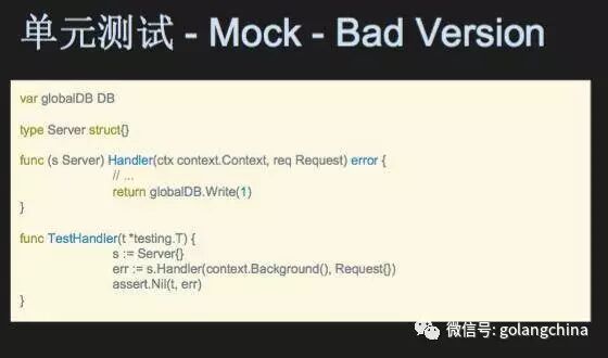 讲到单元测试就引出另外一个话题,我们做单元测试的时候,刚开始写Go年少无知引出很多其他不好的习惯,做出不好的实践。其中之一如图 7 这个东西,数据库是一个全局的单例。我测试的时候不想写数据库,首先CI数据库本身不稳定,我不知道是数据库出错还是我程序出错。同样全局的单例,我们也写了很多把函数定义成变量,在另外一个地方测试的时候直接替换函数的定量,你的代码结构会变得非常难看,这是一个比较不好的实践。