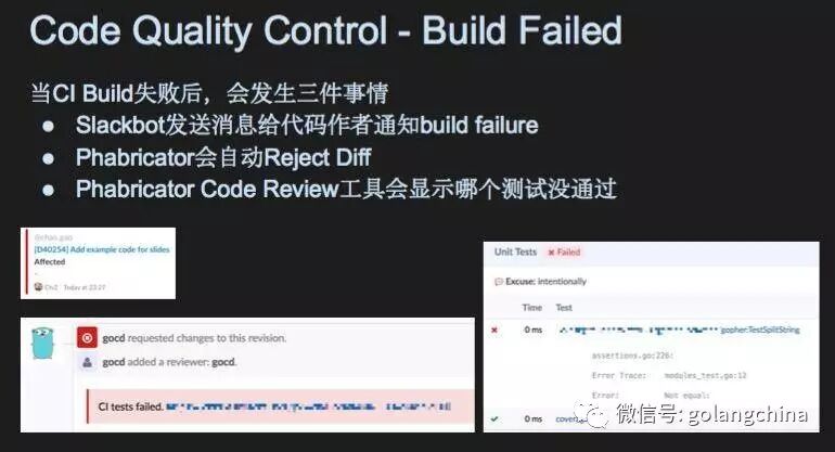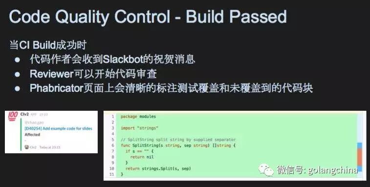 接下来代码提交了,我们会把我们的代码放到CI里面,CI里面跑的就是更大规模测试,包括简单的集成测试。我们有用一串CI的脚本都是用Go写的。代码被传上去了,收到请求说我要测试,跑单元测试和端到端测试,过了5分钟,CI成功了,代码成功了。小机器人就会发一条消息给你,恭喜你,你的代码测试成功了。 Phabricator会清晰显示你代码哪个部分被测试所覆盖,哪个部分没有。比如这个代码块错误检查的地方就没有被测试覆盖,蓝色就被覆盖。这个可以提升效率,首先你写的测试合理合法,测试覆盖过的代码,就不需要花太多精力检查漏洞,测试没有覆盖到的地方,或者提交上来的地方没有覆盖到,可能本身就有问题,这是成功的情况。