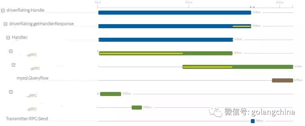 图5是我们系统里面的真实图,这是一个请求司机评分,在他进入之后会调用另外一个后端服务,那个服务会调用司机的评分,他的数据存在 mysql,耗时两毫秒。有了这么一个图,你想诊断你的性能信息或者系统的瓶颈,就可以帮你很快的缩小范围诊断。而且这个力度,是你可以自己控制的,我们这边只做到这几个,当中可能还有一些计算当天时间之类的函数,你都可以加上去。同时,你还可以根据服务间的协议做一些分析,比如服务A和B之间的协议,服务B必须在100毫秒之内返回请求,服务B实际花了120毫秒,根据这个图就可以到服务B的维护者里面,为什么这个慢,可以做到密度的监控。