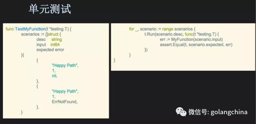 先讲单元测试,图 7的代码大家应该都不陌生,表格驱动的测试。最基本的是你定义一串测试场景 ,然后定义你要测试函数的输入和输出和有没有期待错误,在边就可以用一个循环来 进行不同场景的测试,扩展性非常好,当你想要测试另外一个场景的时候,你只需要在场景定义的 struct 里面添加 就可以了。我们做单元测试的时候,用的 testify 这个包,它可以提供很方便的函数,也是内部的规范。