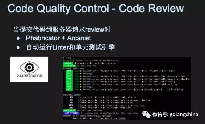 解决这个问题就是要用好的工具提高Code Review的效率,减少Code Review带来的人与人之间的摩擦。我们用的工具主要是这三个,Phabricator、 Jenkins和Slackbot。Phabricator是facebook开源的Code Review工具。这三个工具具体如何协作起来工作呢?首先当一个代码写好,我第一件事情想要部署这个代码,我们是工程师我们想要创造价值,可是代码的质量是不是能够部署下去,也是一个问题。工具就是为了保障每个代码至少是能看的,怎么做呢?当我们的工程师写好代码,他会有一个命令,它首先会跑Linter,你的代码基本条件有没有保证边缘条件有没有检查到。我们之前是用GoLniter,我们现在也在研究自己的。Linter检查什么东西呢?比如说你有一个错误,它就会说这个错误不能忽略,要明确的解决这个错误。你的代码虽然可能是可读的,但全是漏洞,我们还要跑一遍测试,在本地跑一遍代码更改所有包测试,你的代码会不会引进其他的漏洞,全跑一遍。跑这个测试的过程中,会有测试覆盖率的报告。假如说你的测试覆盖率没有达到我们想要的水准,你的代码审查是不会被提交的。因为测试覆盖率是我们审核代码质量一个很重要的指标,所以说我们通过这样的方式,来尽可能保证看到的代码是有一定的质量。