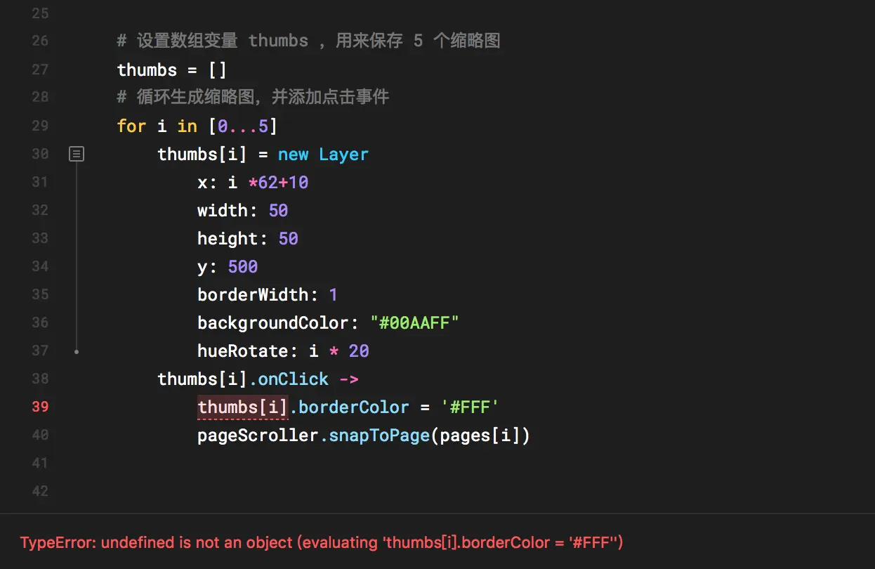 我们看一下这句错误提示:TypeError: undefined is not an object (evaluating 'thumbs[i].borderColor = '#FFF'') ,翻译成中文就是:类型错误:未定义的值不是一个对象(当解析 thumbs[i].borderColor = '#FFF' 发生) 。再看一下代码,发现第 39 行的 thumbs[i] 被标红了,就说明它不是一个对象。但是 thumbs[i] 不应该是第 i 个缩略图吗?我们先验证一下:注释这两行代码,同时加上一行 print i 看输出的是不是点击的缩略图序号。