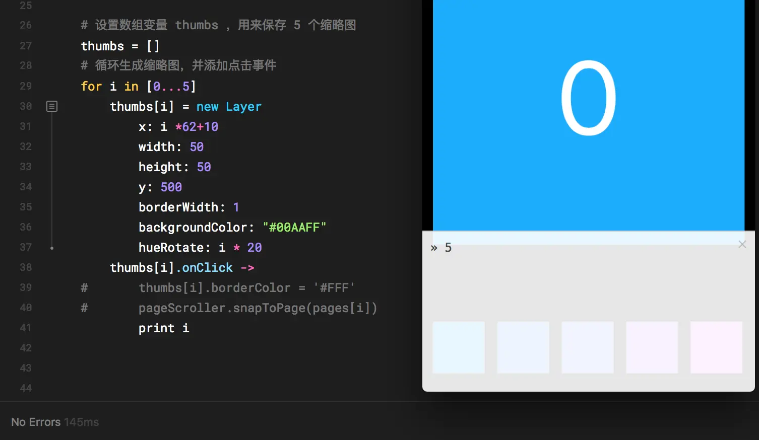 thumbs[i].onClick ( () -> print i )对于上面这段代码,函数的上下文 this 指代的就是当前点击的图层。所以我们可以这么写: