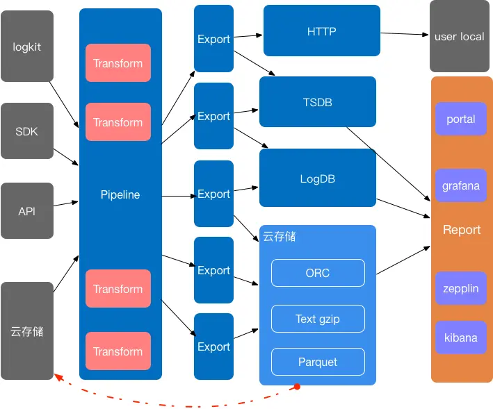 Pipeline就是这样一条数据总线,在数据总线的基础上我们打通一条条管,根据所需的场景导出到后端相应的存储服务上。同时据此来进行资源分配和任务管理。这样一来,就可以避免用户技术选型及技术架构与使用姿势和业务场景不匹配的情况,同时也可以利用云计算的优势,按需分配、快速扩容。