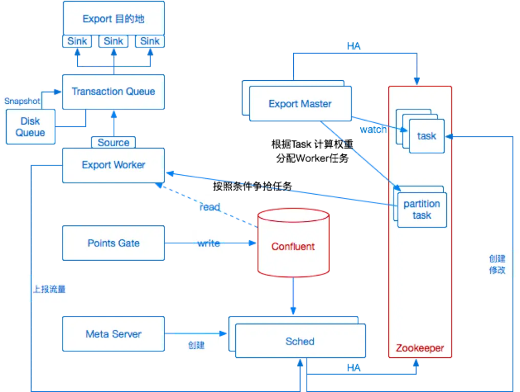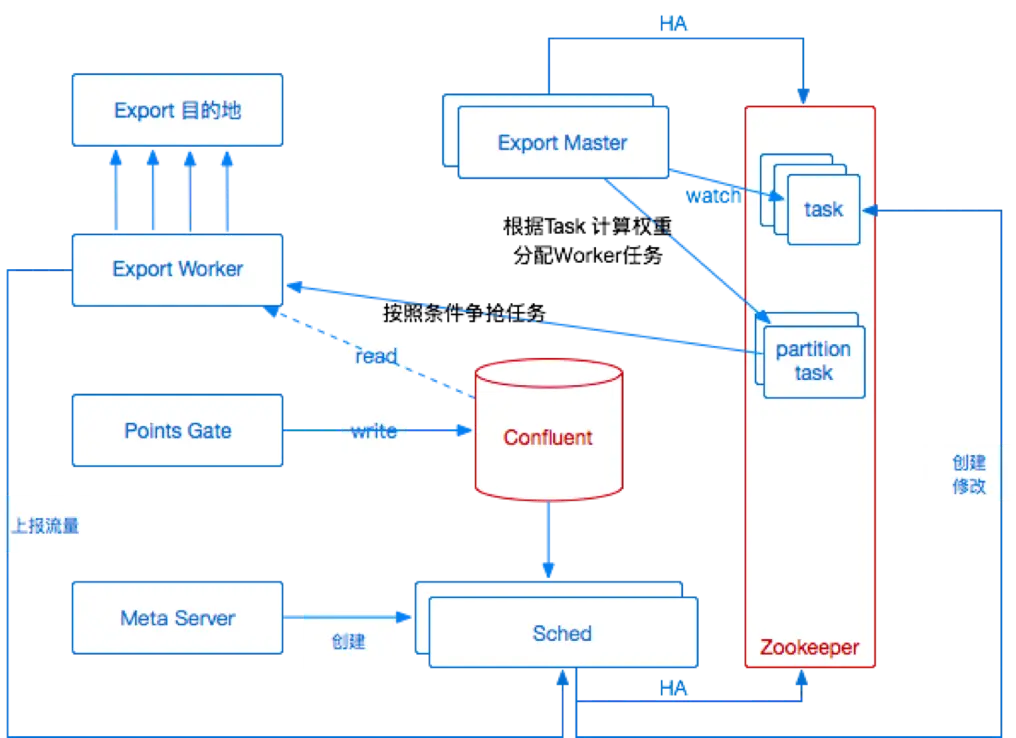 除此之外还有分布式系统的常见问题,需要保证服务高可用,以及水平扩展的能力。保证任务单元标准化,任务粒度可以切分扩展;保证调度任务节点故障不影响其他节点的正常导出等等。