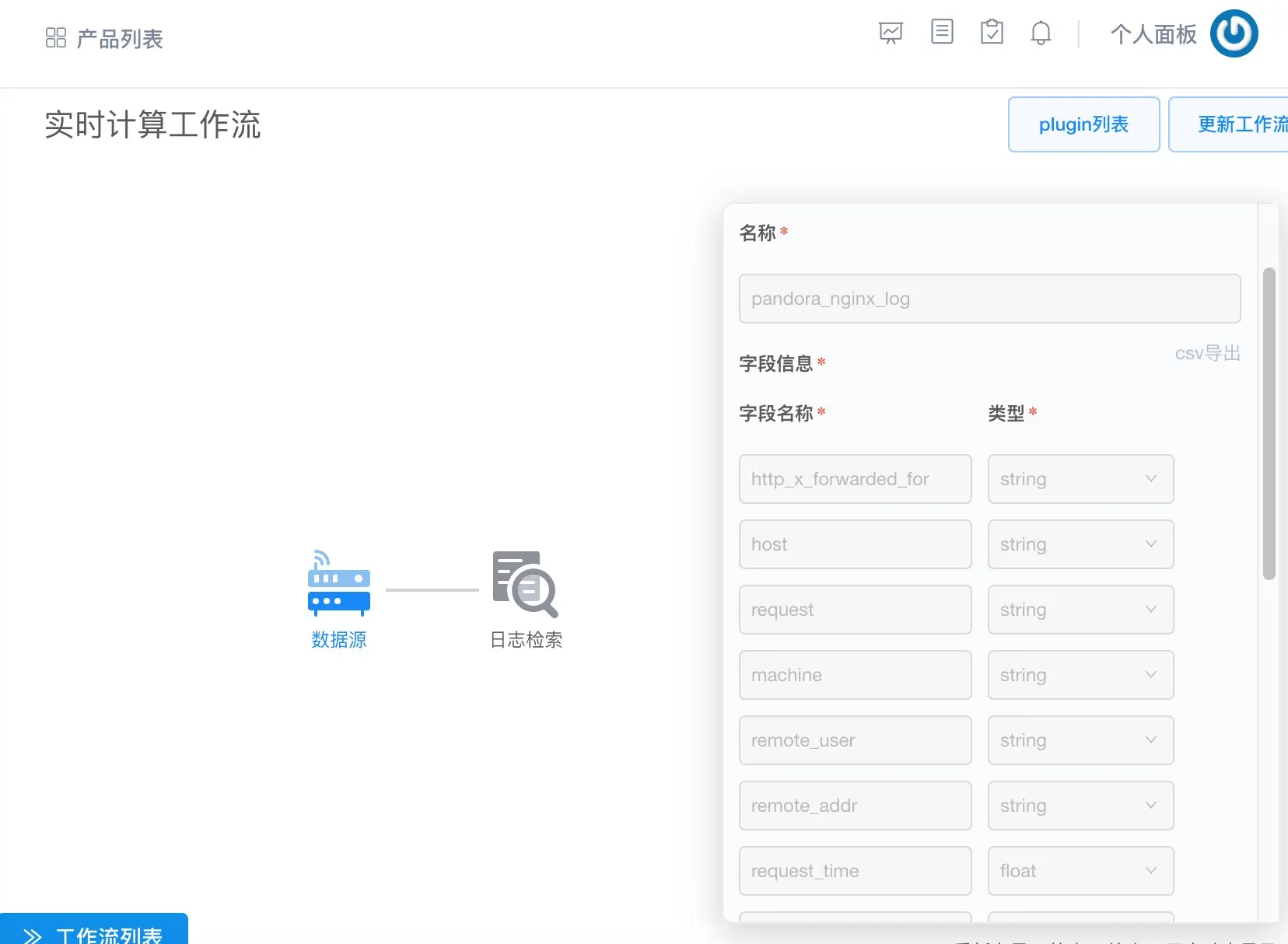 通过简单的几步配置后,你的数据便已经上传到Pandora平台,并自动生成了工作流,并且创建好了导出到日志检索服务,如图 17 所示。
