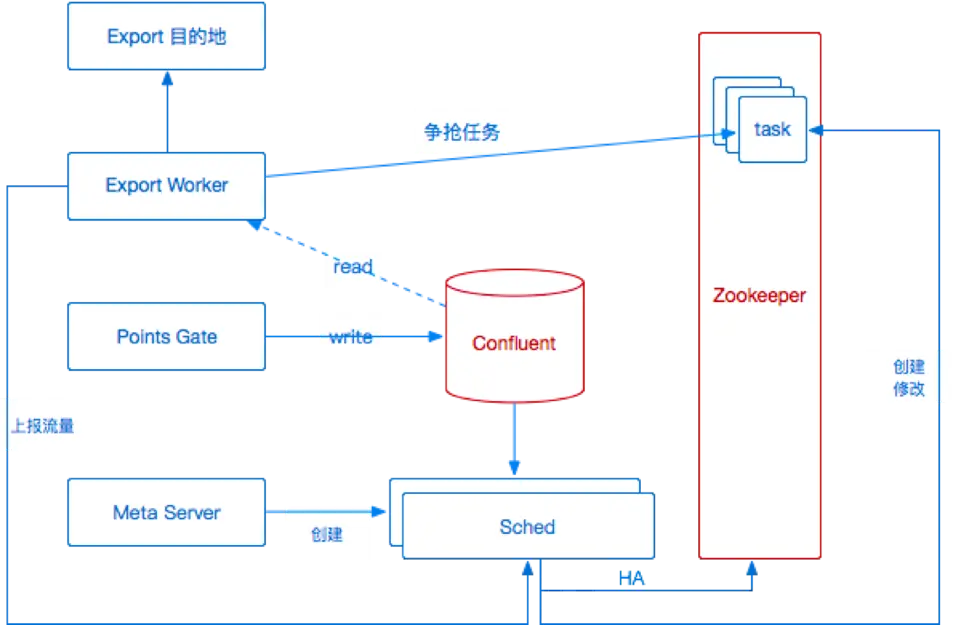 在最初的版本中,我们会在 zookeeper 上面创建一个任务(task) ,Export 通过分布式锁对task进行争抢,被抢到的任务则开始直接导出,如图 9 所示。