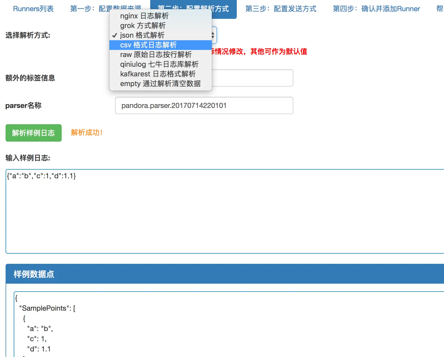 根据需要一步步选择数据源、配置解析方式、发送方式最后确认并添加。当然,在配置解析方式的页面,你还可以通过页面预先尝试解析器配置是否正确,如图16所示。