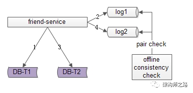 数据的双写不再由好友中心服务来完成,而是由线下的一个服务或者任务来完成,如上图1-6 流程: