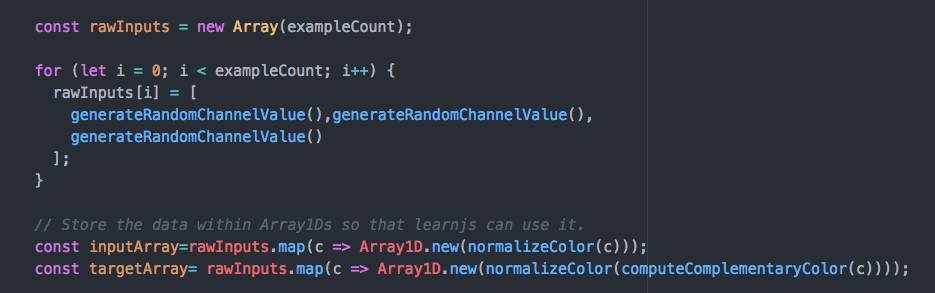通过exampleCount控制生成的训练数据数量,调用generateRandomChannelValue函数生成rawInputs颜色数组。