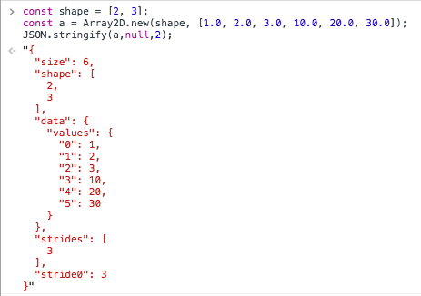 deeplearn.js中用于神经网络计算的数据类型是NDArray。一个NDArray 是由一组浮点值组成的任意数量的数组。NDArray有一个shape属性来定义它的shape。有5种子类型: Scalar,Array1D,Array2D,Array3D,Array4D。