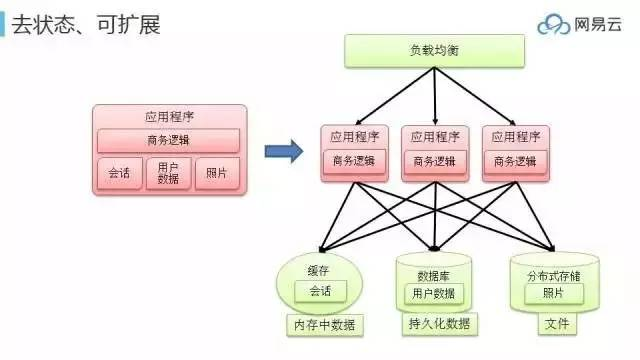 其中有状态的容器只是暂时的方案,还是建议进行应用的无状态化改造,主要就是把内存中的数据保存到缓存中,把用户数据保存到数据库中,把文件保存到分布式存储中。这样应用中只包含商务逻辑,无论怎么扩展都只是商务逻辑的扩展,下面的存储也都有自己的集群,不需要应用层做过多的考虑。