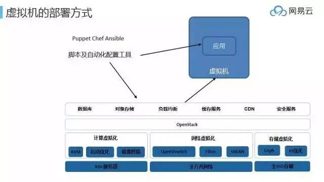 对于开发者来说,之前基于虚拟机的部署,操作上是比较简单的。只要调用IaaS层的API,把虚拟机创建出来;数据库、对象存储等中间件放到PaaS平台就可以了。如果应用比较少,直接手工部署就行,但是如果应用量比较大,或者分的服务比较多,就需要用到一些自动化部署的工具,比如Puppet、Chef和Ansible。之所以要用到这些工具是因为,仅仅资源层面的弹性,并不能满足互联网快速迭代的需求。比如电商大促期间,原来10台机器,要扩展到20台,另外的10台虚拟机还要靠手工一台台去部署,整个扩展的速度还是达不到要求,就要靠脚本做一些事情。