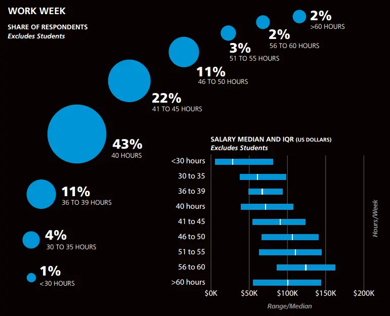 43% 的开发者每周工作 40 小时,工作时间与所得酬劳正相关,足够的付出一定会有足够的回报,但是物极必反,请一定劳逸结合。