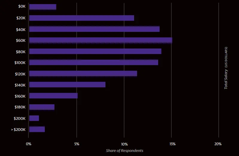薪酬为 60K 的开发者占了最大的比重,且有 42% 的开发者薪酬高于 100K,相比去年涨幅可观。