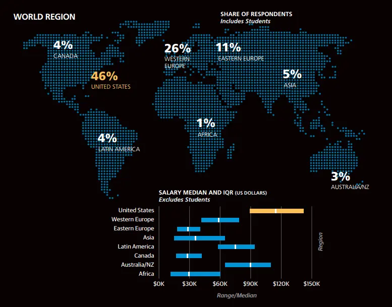本次调查的受访者大多来自像美国、欧洲,但对比去年这个数值有所下降。在薪酬上,美国开发者薪酬远远领先于其他地区。