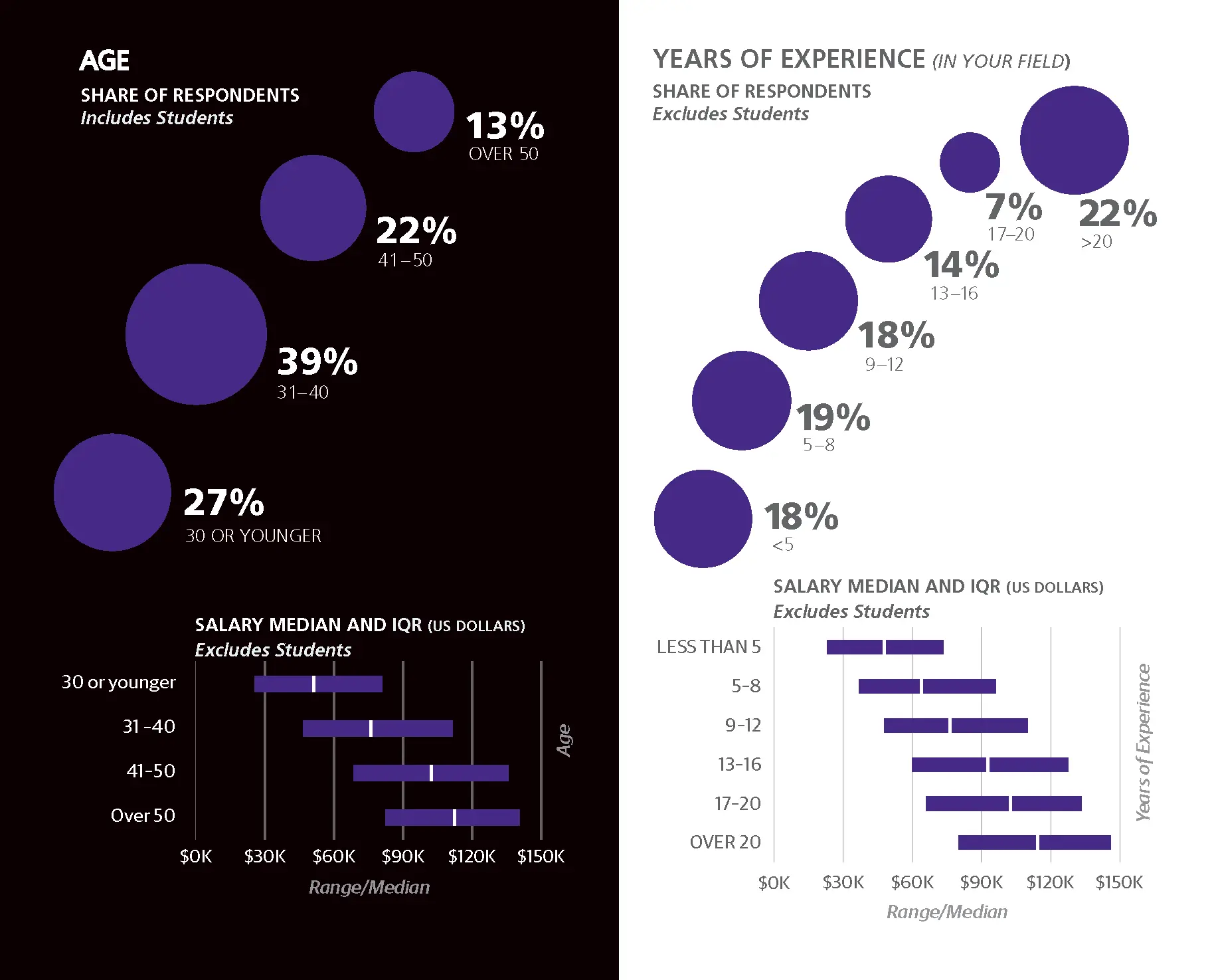 被调查者中大多是 40 岁以下的开发者,其薪酬与年龄的大小正相关分布,而工作经验更是左右其薪酬大小的重要因素。