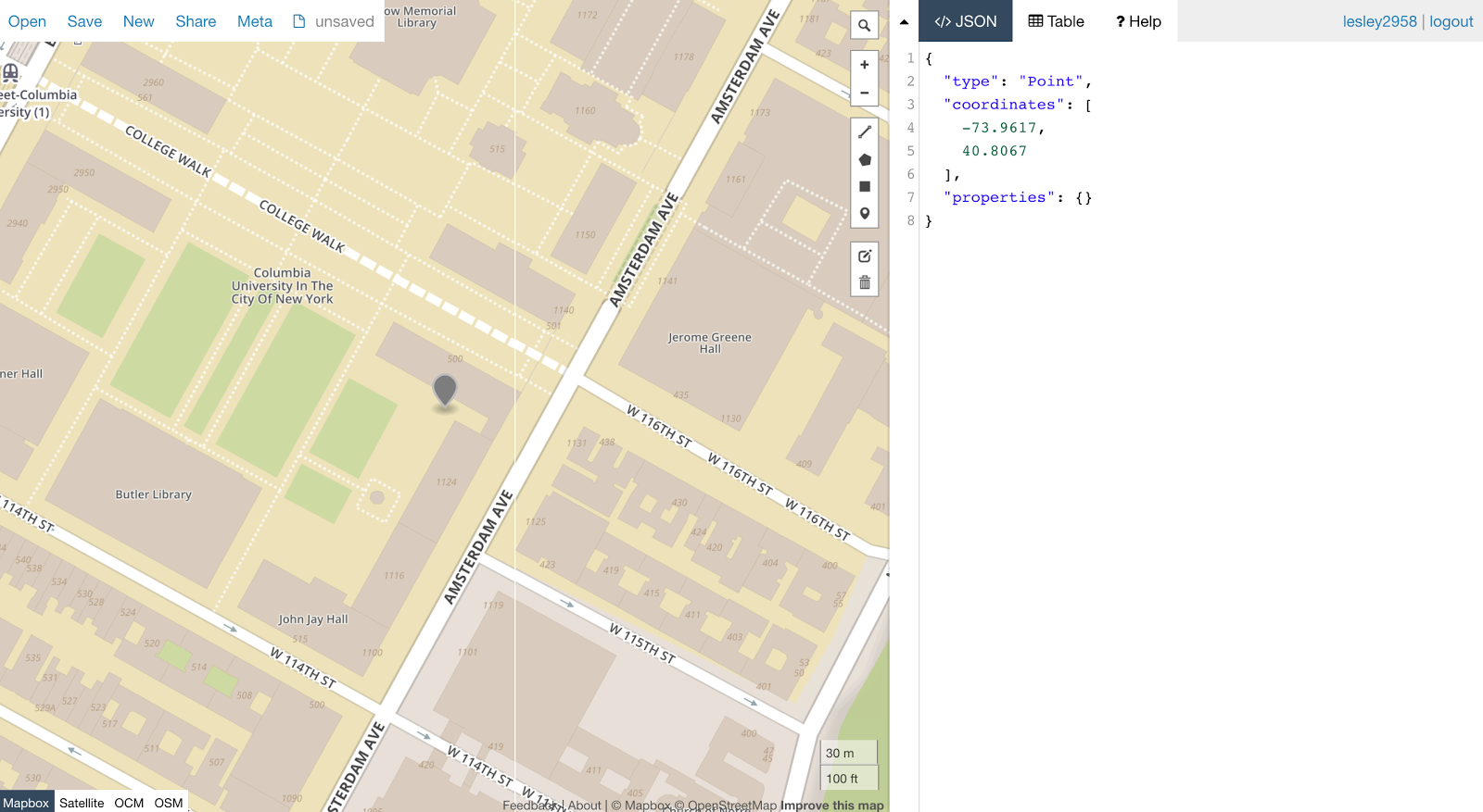 | contents = open('map.geojson').read()print(contents) { "type": "Point", "coordinates": [ -73.9617, 40.8067 ]} |