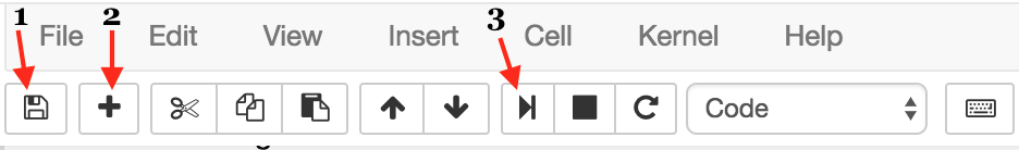 for you to get a grasp of: the save button (1), add cell button (2), and run cell button (3).