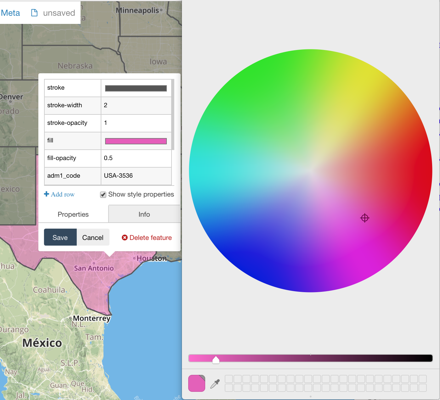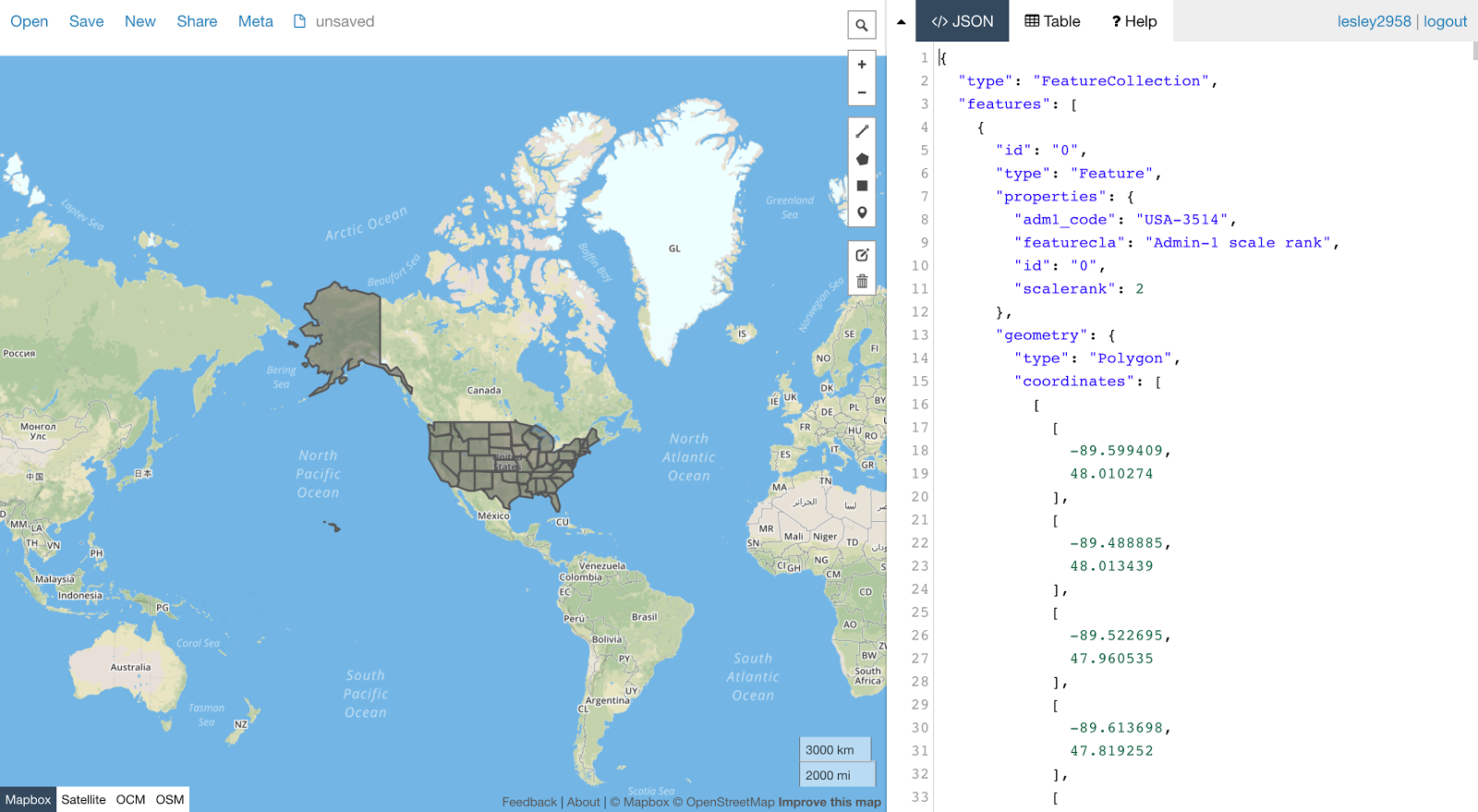 On the left of the page, you can see that the GeoJSON displayed and available for editing. If you zoom in and select a geometric object, you’ll see that you also have the option to customize it:
