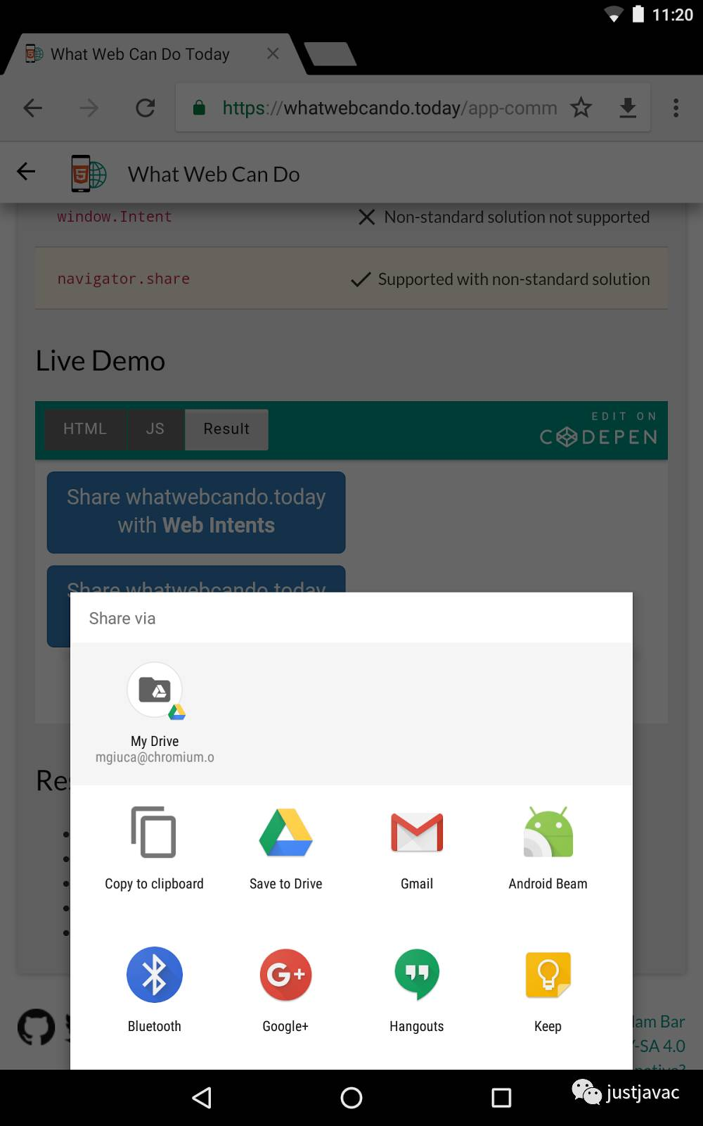 网站现在可以在 Chrome for Android 上使用新的 navigator.share API 来触发本机 Android 共享对话框,允许用户轻松地与任何已安装的本机应用程序共享文本或链接。在将来的版本中,此 API 也可以分享到已安装的 Web 应用程序。