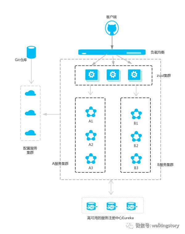 客户端的请求首先经过负载均衡(zuul、Ngnix),再到达服务网关(zuul集群),然后再到具体的服务,服务统一注册到高可用的服务注册中心集群,服务的所有的配置文件由配置服务管理(下一篇文章讲述),配置服务的配置文件放在git仓库,方便开发人员随时改配置。