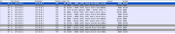 通过 wireshark 捕获请求,可以看到客户端经过三次握手和服务端连接成功,接下来双方开始发送数据,发送完成后,四次挥手断开连接。