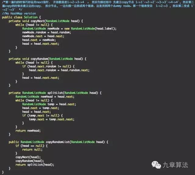 需要查重的时候,自然想到了散列表(哈希表),所以每次新建一个节点时,都将原链表里的节点和新的节点放入HashMap中,以原节点为键,新节点为值,这样在复制next指针指向的节点、或者是random指针指向的节点时,都可以在O(1)的时间内在散列表中找到已经复制过并放入新链表中的新节点。这个算法的时间复杂度是O(N),额外空间复杂度是O(N)。
