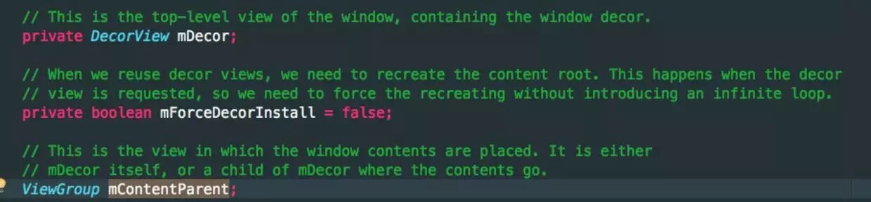 通过定义可以看出,mContentParent是一个ViewGroup类型的变量,它是Activity的一个成员变量。我们所写的setContetView()所设置的布局文件就加到这个视图中。根据官方解释它可能是mDecor自身,也可能是mDecor的子View。