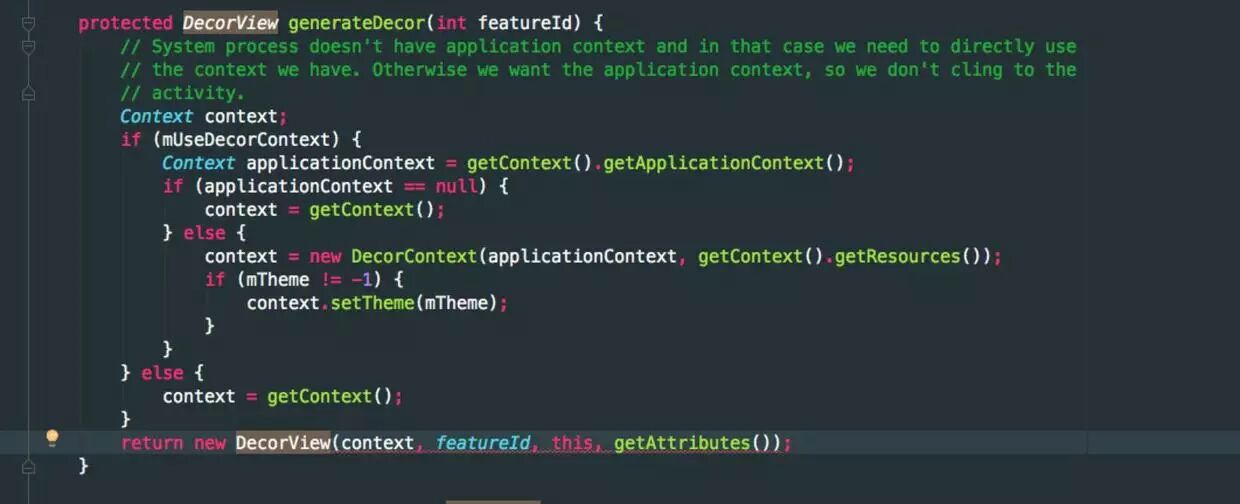 在installDecor方法中标注1处,如果mDecor为空(mDecor是Window持有的一个成员变量,指的就是DecorView),那么在 generateDecor()中去实例化新建DecorView,我们继续跟进generateDecor()查看源代码: