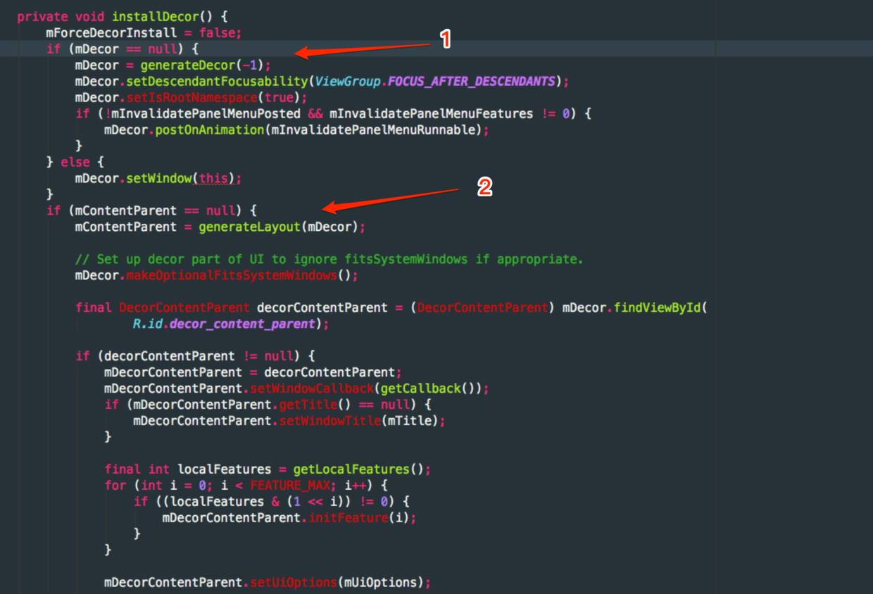 返回到installDecor()方法中继续往下,到标记处2,会判断mContentParent是否为空,如果为空,通过 generateLayout()来将我们具体的布局加载到DecorView中。跟入 generateLayout()方法查看源代码(由于方法中代码过长不便于截图,我贴出关键代码):