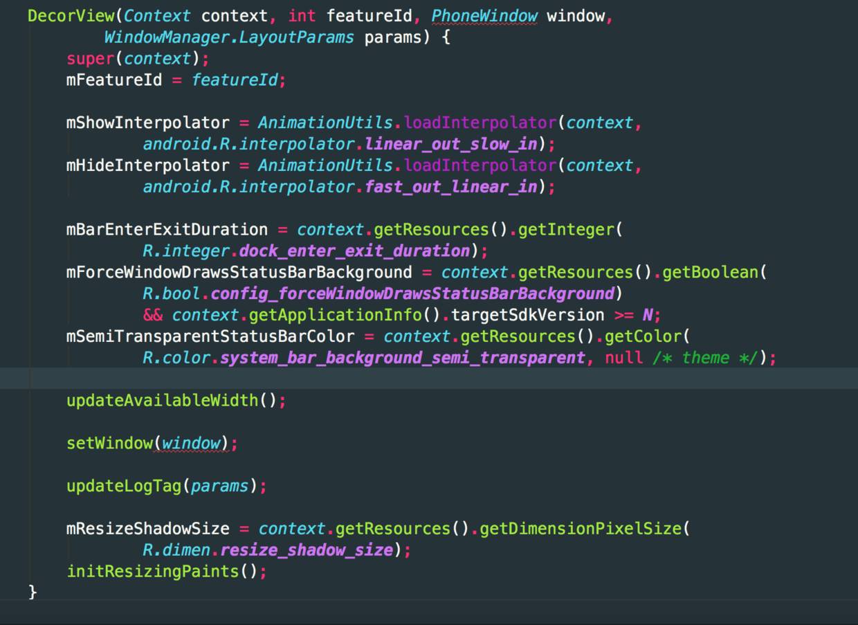 在这里前面一段代码都是初始化所需要的context,最后返回一个实例化的DecorView()。在DecorView构造方法中进行初始化工作。