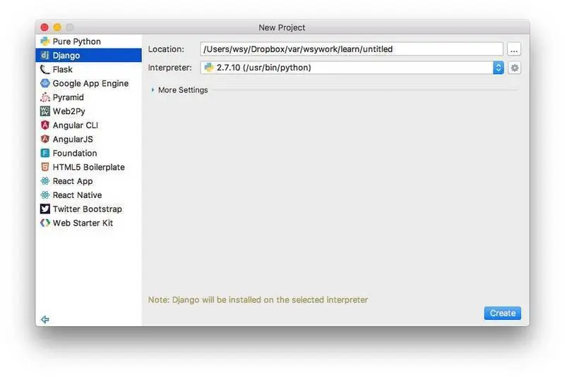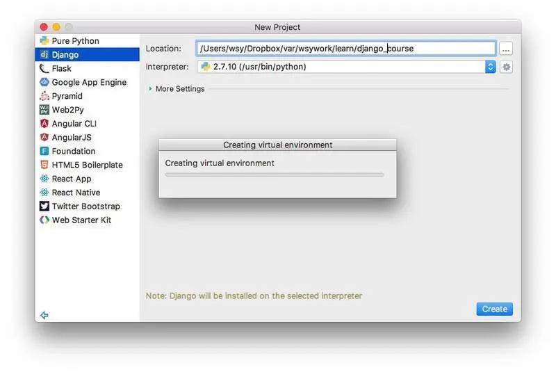 点击右下角的Create,让PyCharm自己帮我们安装Django吧。