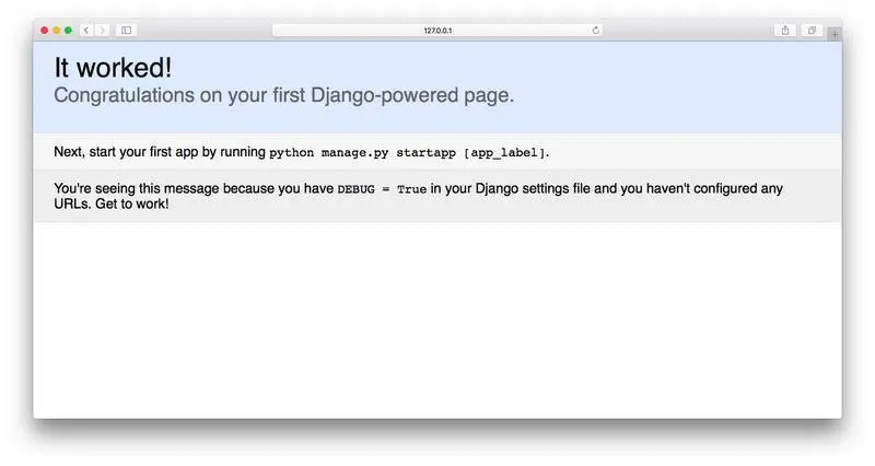 点击其中的蓝色链接,浏览器会开启,并且访问本地已运行的Django App服务。