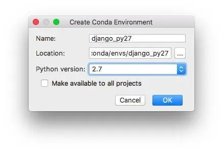 请选择第4个,Create Conda Env。PyCharm将通知Anaconda:“嘿,老兄,为了实验Django编程,我需要你提供一个虚拟软件环境!”