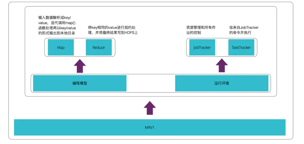 上图是MRV1的主要架构图,我们可以看到,在MRV1里面,主要分为两个部分:运行环境和编程模型,所谓的运行环境,指的是用来进行分布式任务调度、资源分配等任务运行过程中涉及到的信息,而编程模型,则指的是提供给开发人员进行开发的接口。