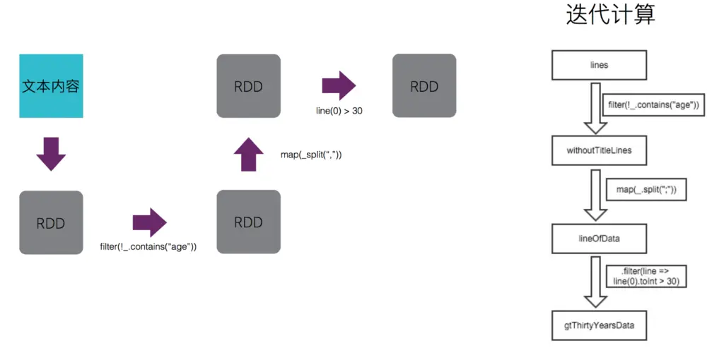 而如果我们的操作是统计共有多少条数据,则需要将数据汇总,所以对于Spark来说,Action才真正会触发“挪数据”这个动作,Transformation只是做了一个标记转换。我们对Spark的各种调优,大部分时间也是在尽量减少Action的操作。由于在Spark里面,RDD是只读的,所以每一次操作,都会产生一个新的RDD,因此可以形成一系列的RDD依赖,我们也叫RDD链。