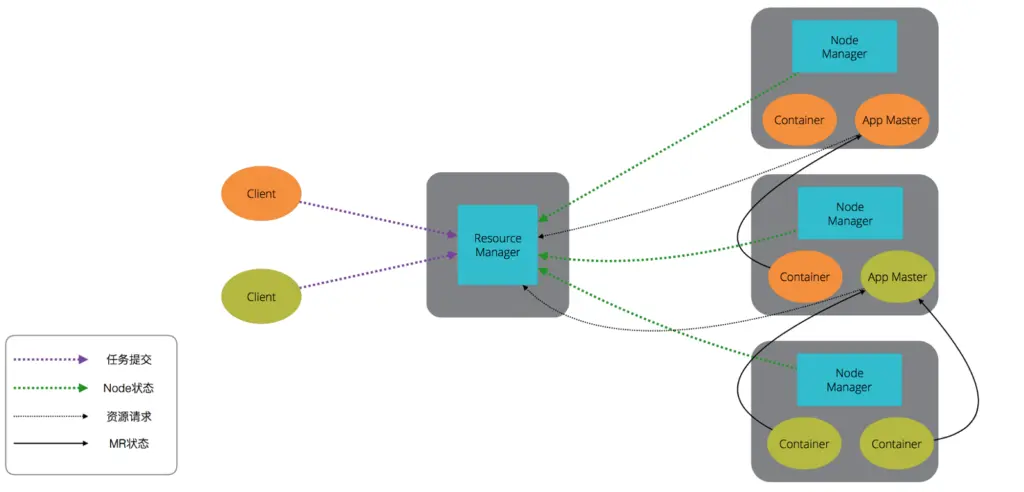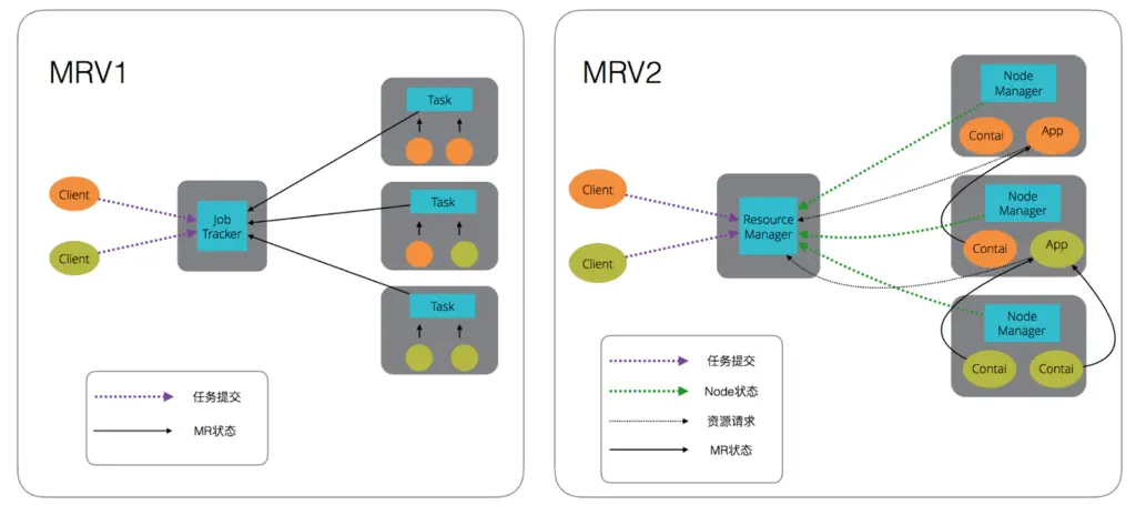 这里面并没有提到Yarn,因为Yarn并不是一个技术,而是一个概念,代表V2里面整个任务调度和资源管理系统。我们合并起来统一称为:Yarn。