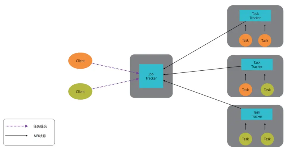 可以看到,在MRV1里面,当我们的一个任务被提交上去之后,由统一的调度器进行任务的监控、分发,以及资源的申请、回收控制等操作。