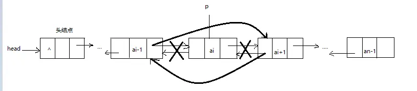 p指向双链表中的某个结点,删除p指向的结点示意图如下所示:
