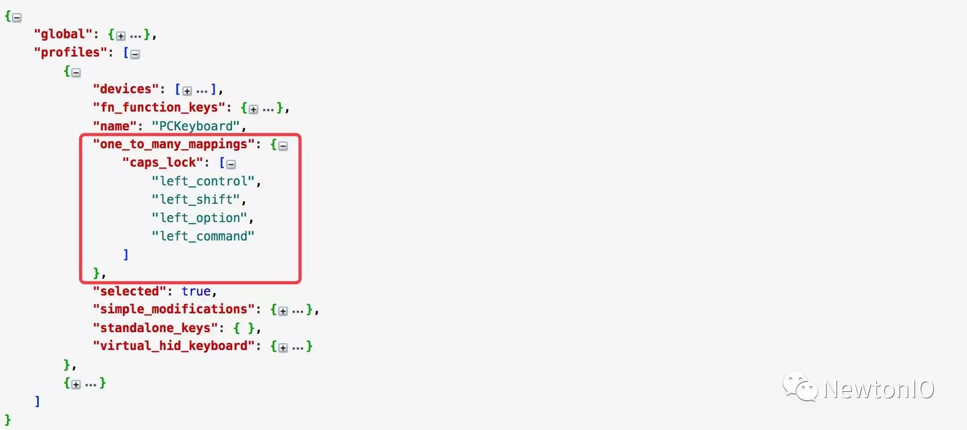 可以看到 Karabiner 所有的配置描述都并列的写在了 profiles 这个 key 里面。
