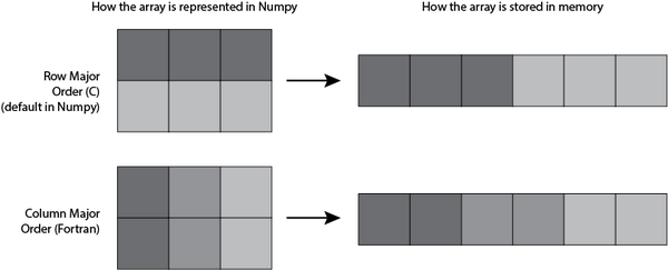 这篇 Blog的图显示. 在我们看来的 2D Array, 如果追溯到计算机内存里, 它其实是储存在一个连续空间上的. 而对于这个连续空间, 我们如果创建 Array 的方式不同, 在这个连续空间上的排列顺序也有不同. 这将影响之后所有的事情! 我们后面会用 Python 进行运算时间测试.
