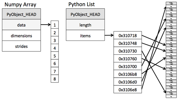 其实 Numpy 就是 C 的逻辑, 创建存储容器 "Array" 的时候是寻找内存上的一连串区域来存放, 而 Python 存放的时候则是不连续的区域, 这使得 Python 在索引这个容器里的数据时不是那么有效率. Numpy 只需要再这块固定的连续区域前后走走就能不费吹灰之力拿到数据. 下图是来自 Why Python is Slow: Looking Under the Hood, 他很好的解释了这一切.