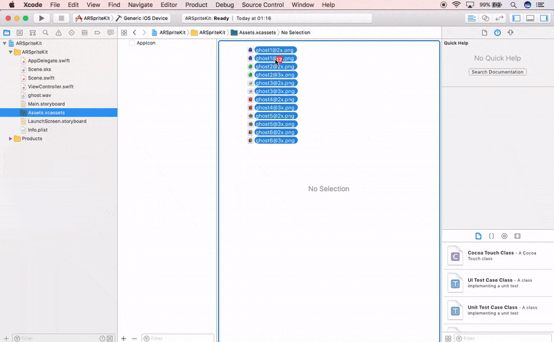 现在,现在是时候添加幽灵图片了。在我的例子中,图片的格式原来是 SVG ,所以我转换到了 PNG ,并且为了简单起见,只加了图片中的前 6 个幽灵,创建了 2X 和 3X 版本(我没看见创建 1X 版本的地方,因此采用了缩放策略的设备不能够正常的运行这个应用)。